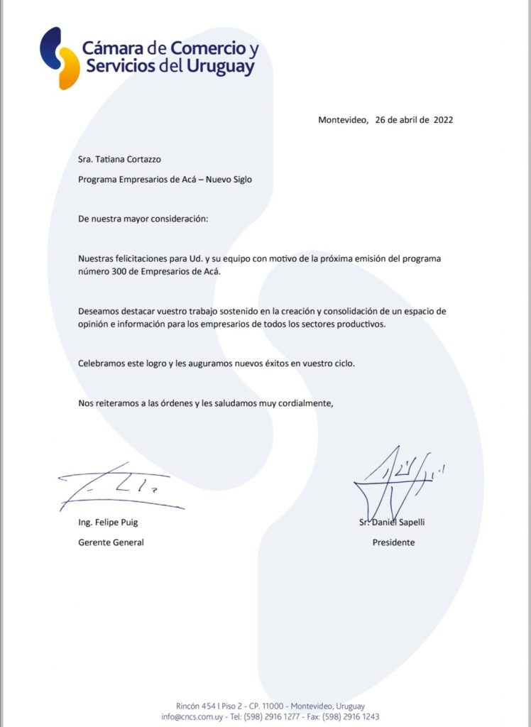 Con motivo de cumplirse el programa número 300, la Cámara Nacional de Comercio y Servicios envió una nota firmada por su Presidente, Daniel Sapelli para felicitar a Tatiana Cortazzo, conductora y productora general de Empresarios de Acá.